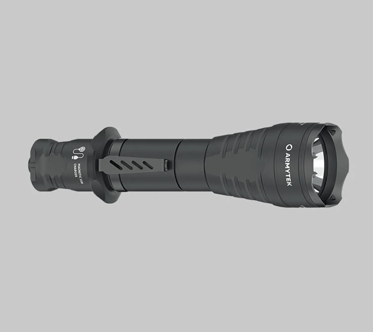 Az Armytek Predator Pro Magnet USB lámpa szettet kifejezetten vadászati és taktikai igényekhez és igénybevételekhez tervezte a gyártó, hiszen a fegyverlámpáknál a nagy hatótávolság és a szűk megvilágítási fénykúp elengedhetetlen a pontos célzáshoz. További fontos kritérium az alacsony súly, a csúszás menetes markolat, a hosszú működési idő és a lámpa végére tervezett kapcsológomb, amivel a lámpa kesztyűben is biztonságosan használható. A kapcsológomb távkapcsolóra is "cserélhető", amire főként fegyverre szerelve van nagy szükség, azonban a régebbi modellekkel ellentétben nincs szükség a kapcsoló eltávolítására, hiszen a mágneses töltőhöz hasonlóan, közvetlenül a kapcsológombra rögzül a mágneses távkapcsoló/töltő vége. Ez a megoldás jóval gyorsabb bevethetőséget biztosít! Az Armytek Predator Pro Magnet USB család teljesen kompatibilis az Armytek színszűrő előtétekkel, fegyverszerelékekkel, azonban az új Magnet USB véghez új töltőkábel (AMC-03) és mágneses lengőkapcsoló (MRS-01) lett tervezve.