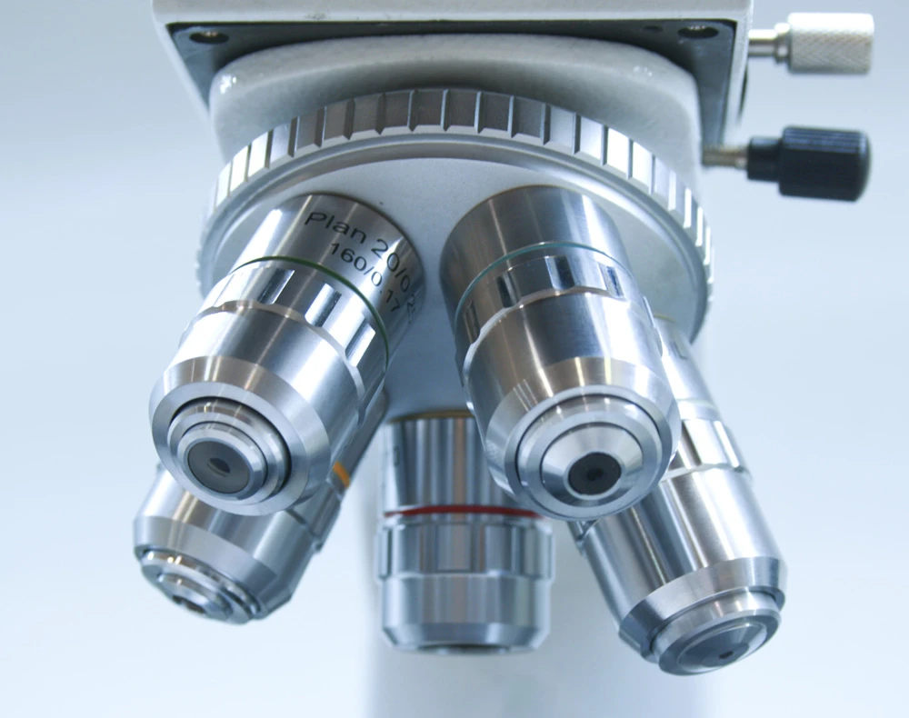 A mikroszkóp öt darab plan akromatikus objektívvel rendelkezik, melyek a semiplan objetíveknél jobb szélkorrigáltsággal rendelkeznek és éles, kontrasztos képet rajzolnak egészen a látómező pereméig. Az alapfelszereltség 4x-10x-20x-40x-100x nagyítású objektíveket tartalmaz, melyek DIN szabványú csatlakozásuknak köszönhetően könnyen cserélhetőek. A 40x és a 100x-os objektív rugós megoldása védi a tárgylemezt a véletlen töréstől. A mikroszkóphoz háromféle nagylátószögű plán-okulárból (WF10x, WF12.5x, WF16x) választhat, ezáltal a nagyításokat saját igényeire szabhatja.
