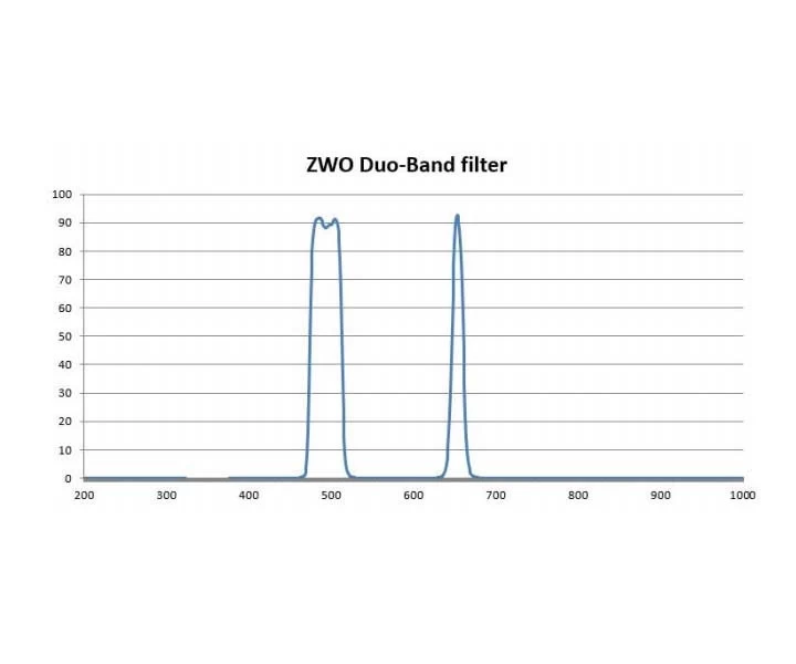 A ZWO Duo-Band keskenysávú szűrő (2") tulajdonképpen kettő az egyben szűrő, hiszen két szűk tartományban is átengedi a fény egyes hullámhosszait, miközben a többi hullámhosszú sugárzást blokkolja.